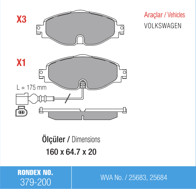 Rondex 379-200 Volkswagen Golf 7, Passat, Tiguan, Touran, T-Roc Fren Balatası